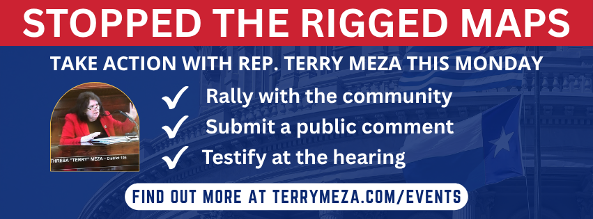Join Democratic State Representative Terry Meza at UT Arlington this Monday, July 28 and help fight against rigged redistricting maps meant to dilute our voices in Irving. The current Special Session calls for a plan to redistrict up to 5 Congressional seats dividing communities of interest.